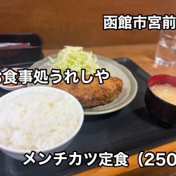 函館市宮前町にある人気の食堂「お食事処うれしや」さんにて メンチカツ定食(250g)をキメたらボリューム満点で満足度MAXでした!