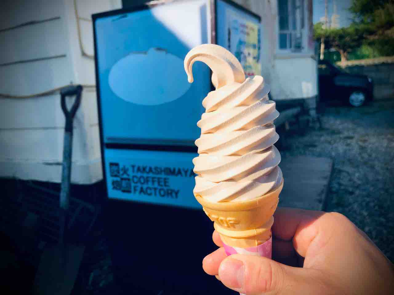 軽く夕陽に照らされた キリマンジャロ珈琲ソフトクリーム頂きます…