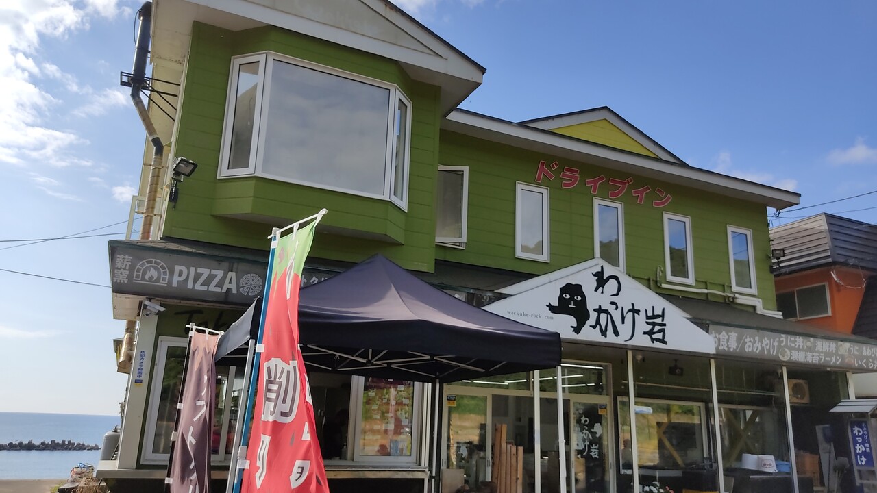 ドライブインの店舗裏を望むと 砂浜に岩に海、海水浴場があるんです。そしてテントを張っているファミリーも多数見受けられました。