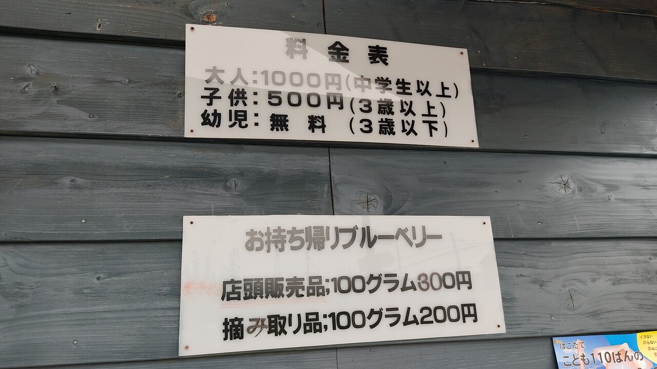 ブルーベリー摘み取りの料金表