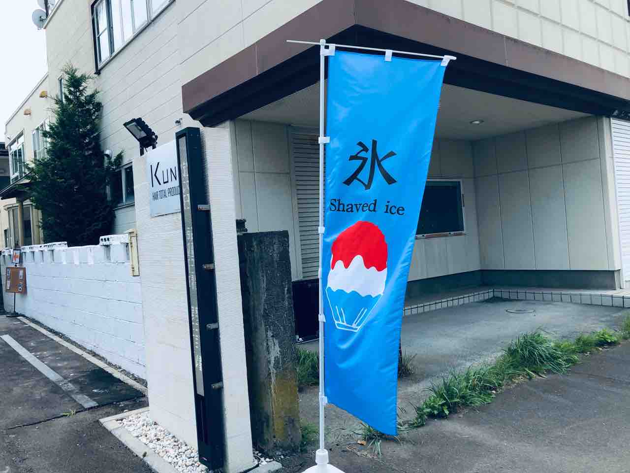 かき氷の幟が美容室の前にあります。