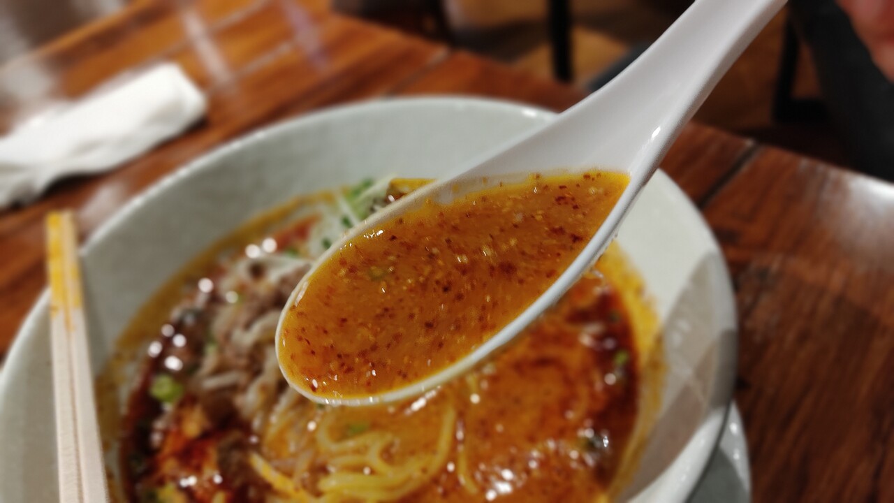 スープを口に運ぶと 最初は甘さが広がり、次に酸味、最後に辛さがやってきますが 辛さも丁度良く美味しく頂けます。