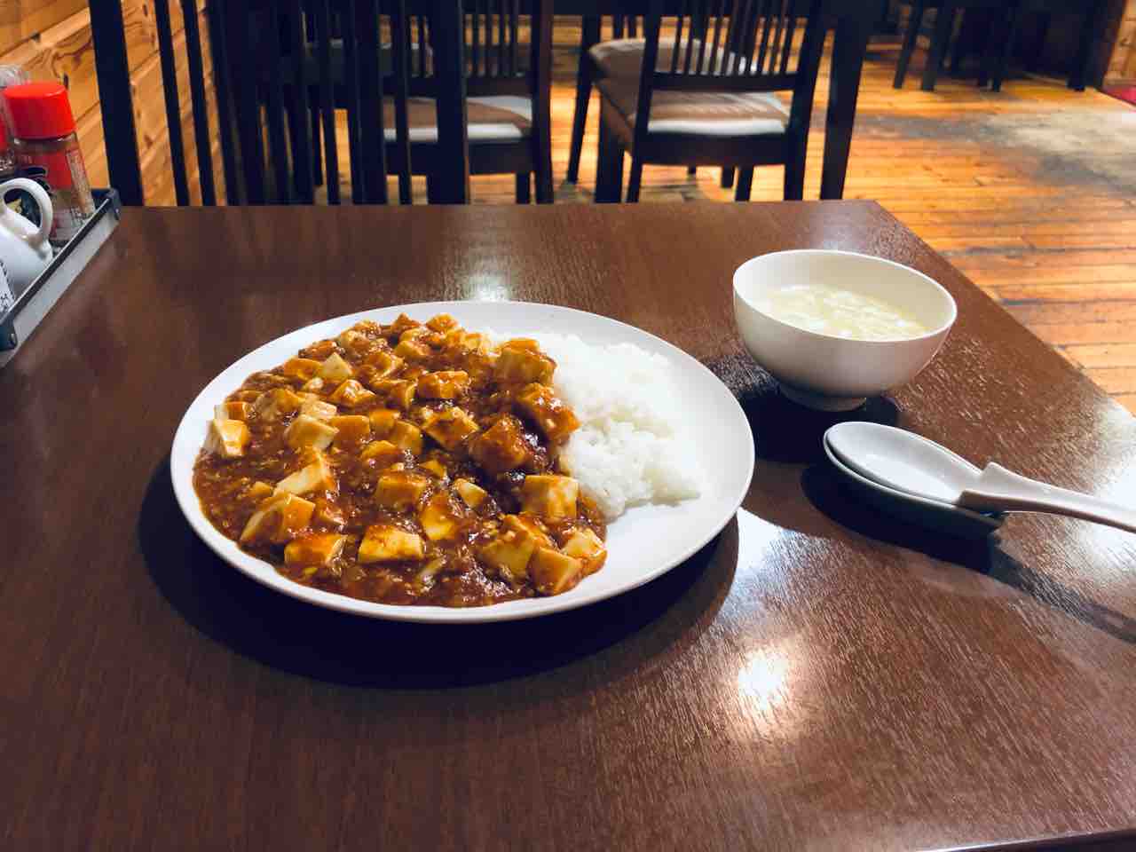 マーボ豆腐丼とスープが運ばれてきました。