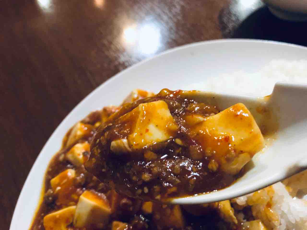 口に運ぶと 最初は甘い麻婆豆腐なのかなと思うも次に痺れ系の辛さが口の中に広がり とは言え程よい辛さで美味しく頂けます。花椒の辛さ痺れかな?