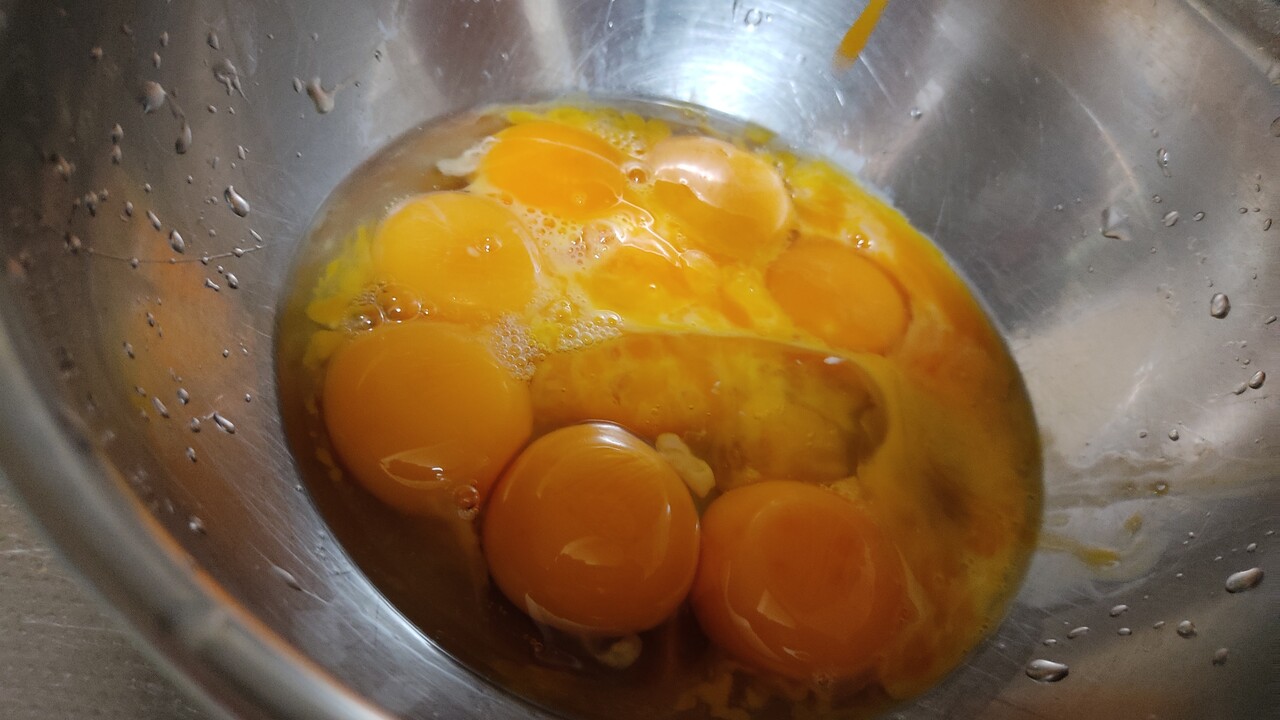 卵黄8個、全卵2個ボールに投入します。ちなみに結構殻が硬く中の膜も丈夫なんです。なので軽く割ろうとすると内膜が破れない事も有ります。