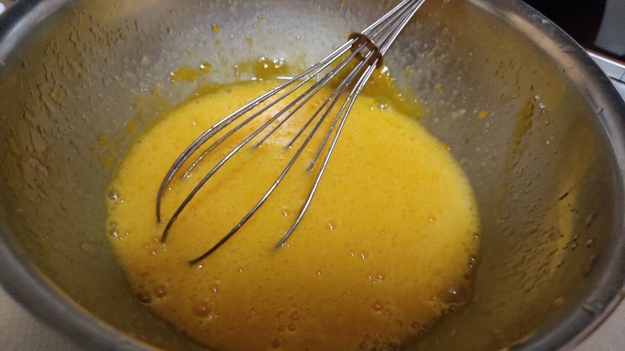 三温糖を100g投入しながら 泡立て器で卵を混ぜていきます。