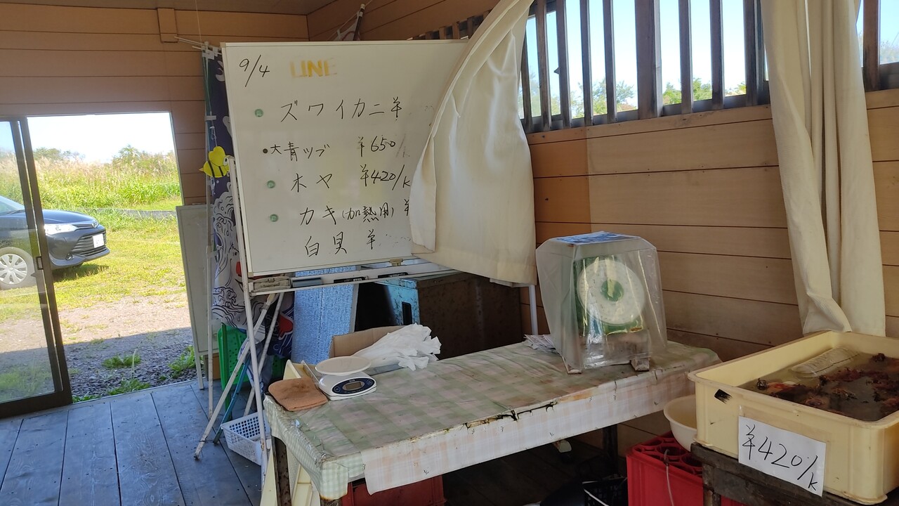 メインの建物があり右手に進むと ホヤ、牡蠣、つぶ貝が販売されておりました。