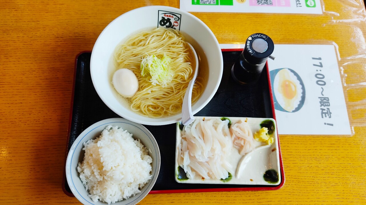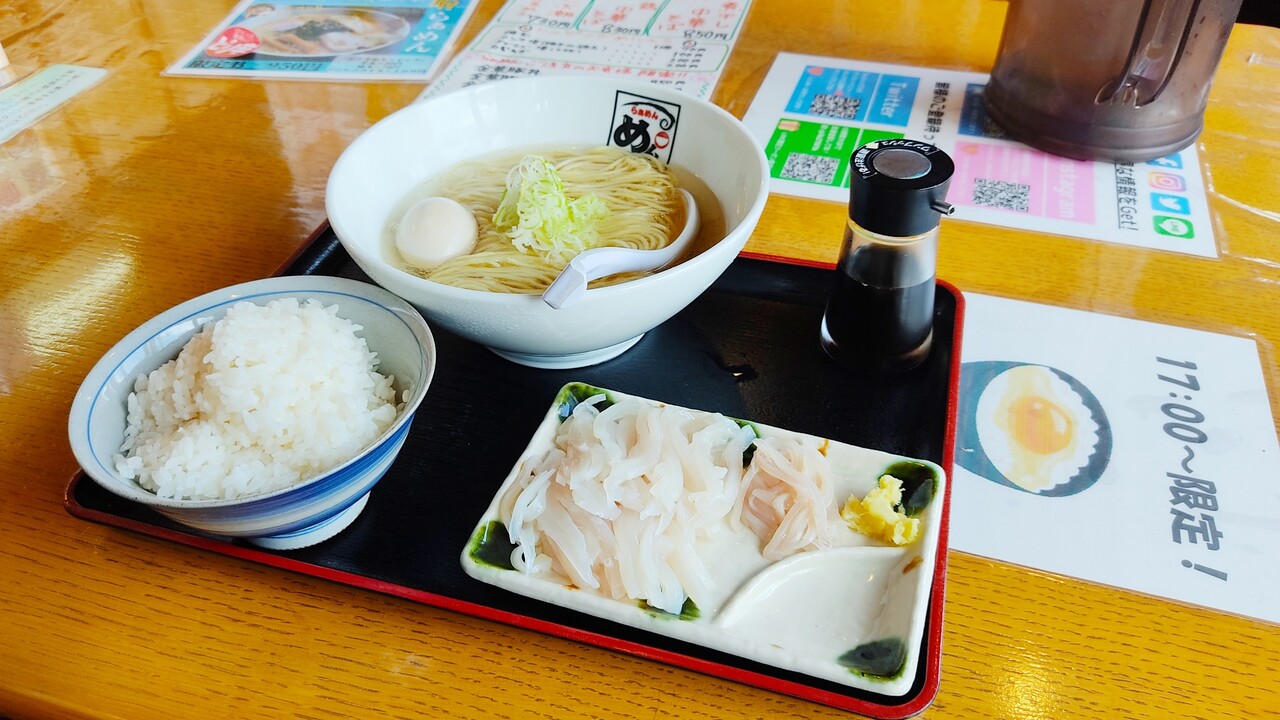 とある日の恐らく朝ラーメンな時間帯に 桔梗町のラーメン屋 らぁめん めんきちさんに伺いました。理由はイカ刺しが食べたかった…