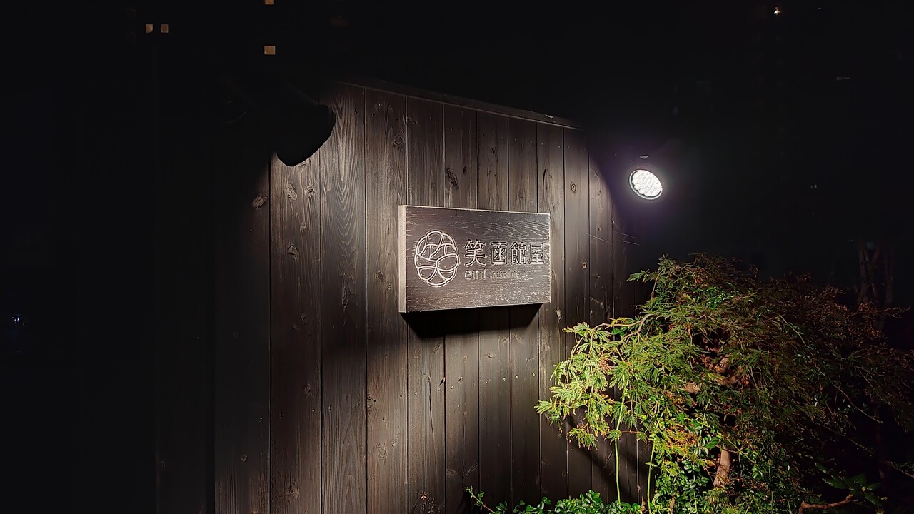 暗闇ですがライトアップにより 笑函館屋さんのロゴが浮かび上がります。