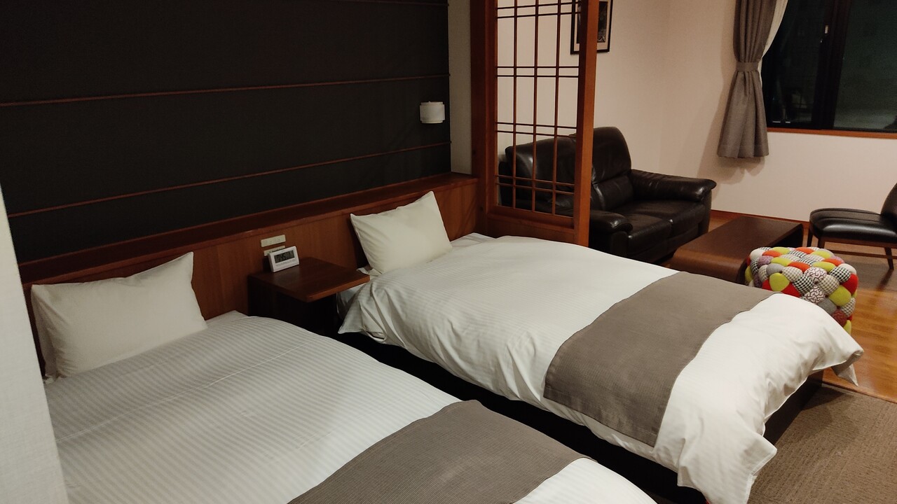 広いお部屋にベッドが2つありまして…