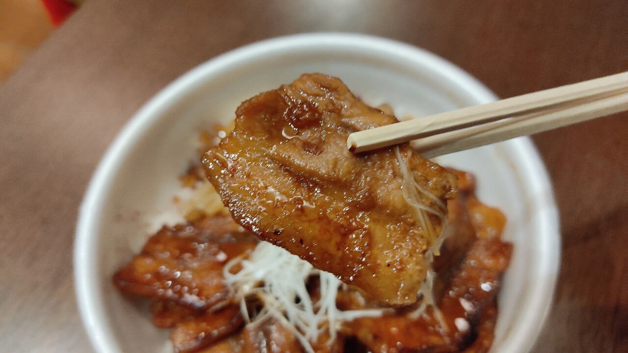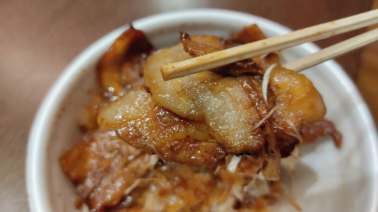 豚バラ肉12枚枚が敷き詰められており、ご飯とお肉のバランスが少しバグっているなぁと嬉しい誤算です。程なくして完食しました。