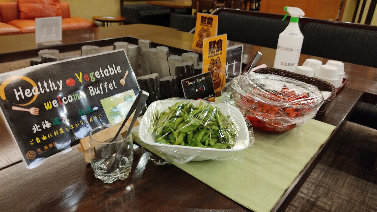 ロビー中央にある囲炉裏の前にはウェルカムドリンクならぬ ウェルカムヘルシーブッフェが御座いましてプチトマトと枝豆が置かれておりました。