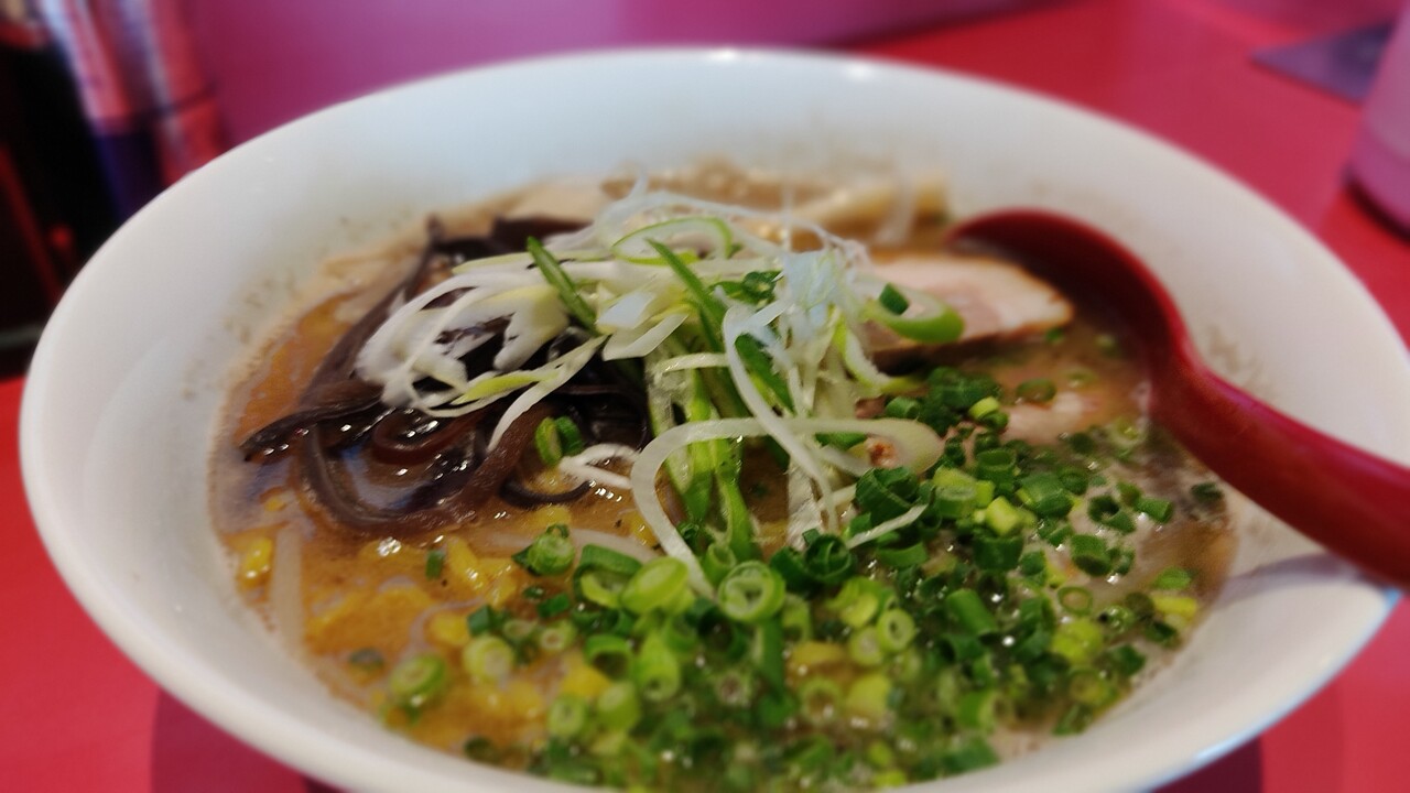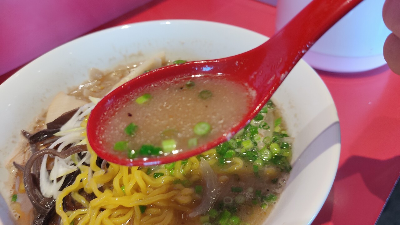 結構オイリーで濃厚な豚骨スープで味も濃い目かなぁと…。最初の数口だけはイケる気がする。