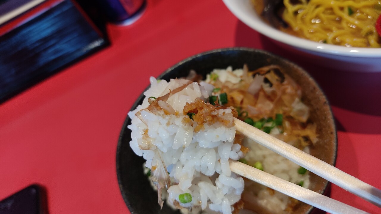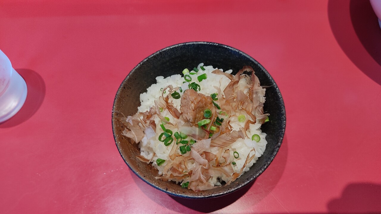 なので 山わさびを温存しつつ 鰹節ご飯として食べ、ラーメンも食べ進めていくと ご飯と山わさびの割合がいい感じなったので一気に食らいつくことにします…