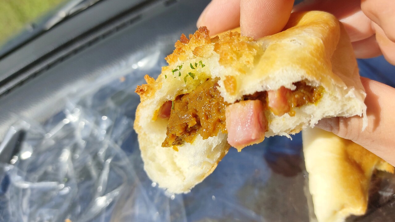 カレーパンを割ると ブロック状のベーコンがゴロっと入っているのが確認できます。それでは頂いて行こうと思います。