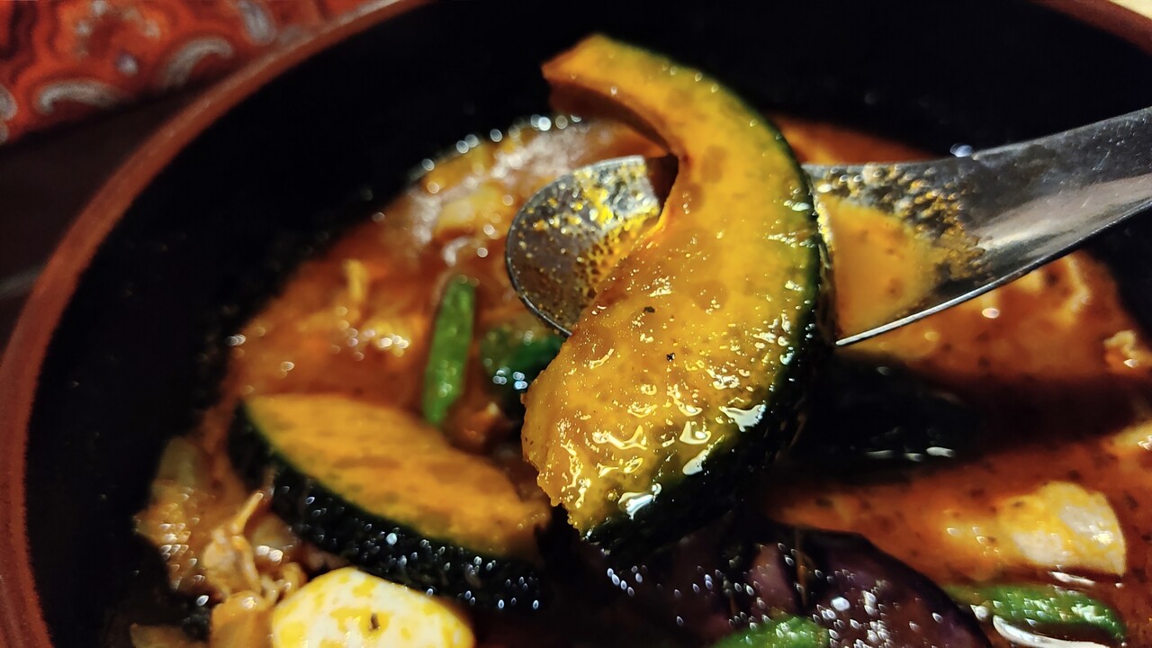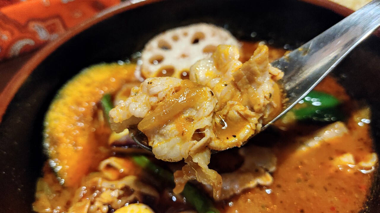 薄くスライスされた豚肉にスパイシーなカレーは相性抜群で美味しく頂けます。