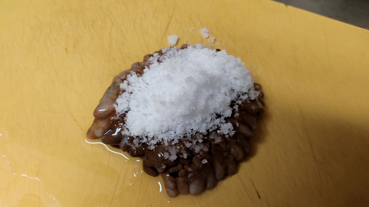 そして腹側?に1本切り込みを入れて開きまして口ばしを除去します。ちなみに高級珍味の素材である 内蔵このわた は抜かれておりました…