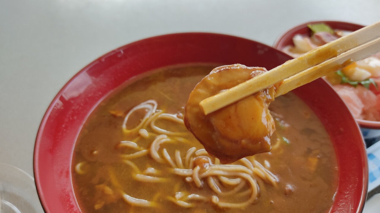 カレーそば(具材は長ネギ、帆立の稚貝)