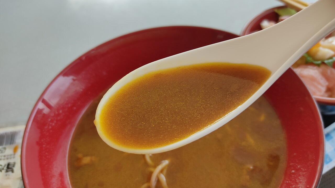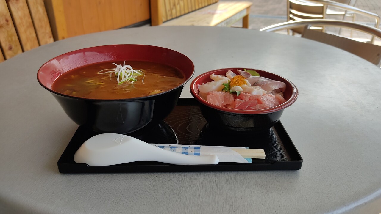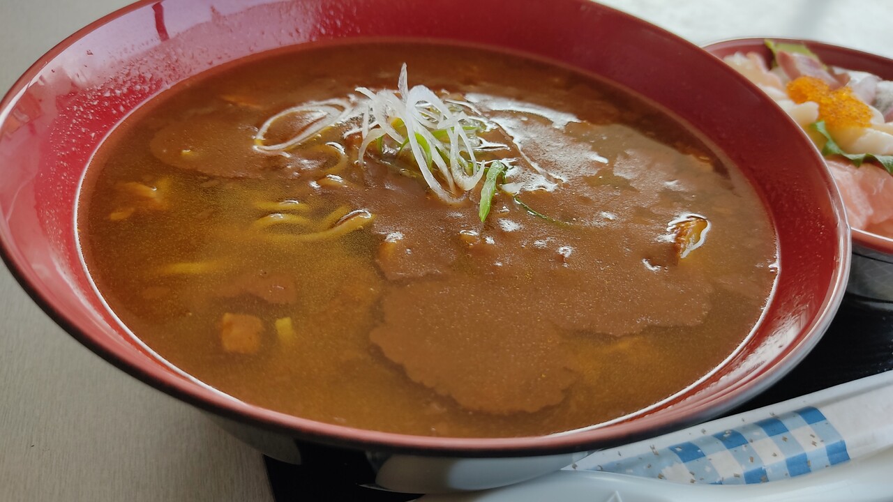 こちらがカレーそばと 海鮮丼です。共にワンコインなので計1,000円税込です。
