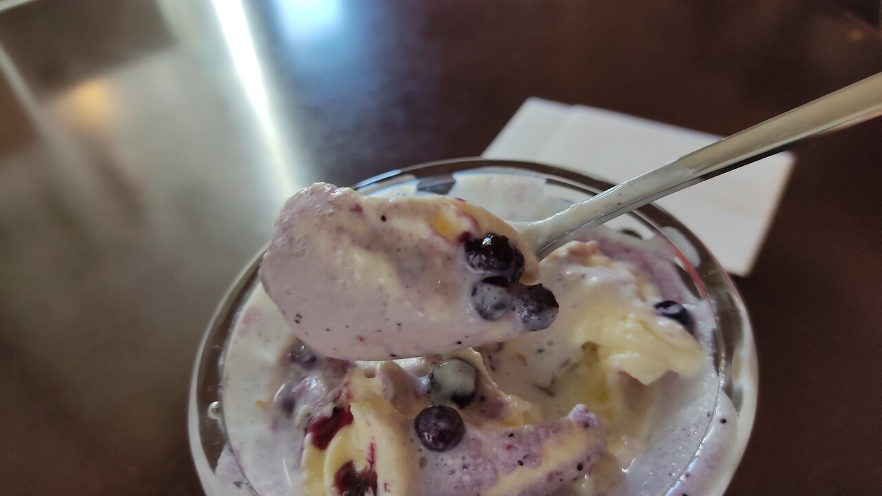 上部はアイスクリームとベリーソースがのってまして口に運びますと アイスクリームの甘さとベリーソースの甘酸っぱさがとても良く美味しく頂けます。