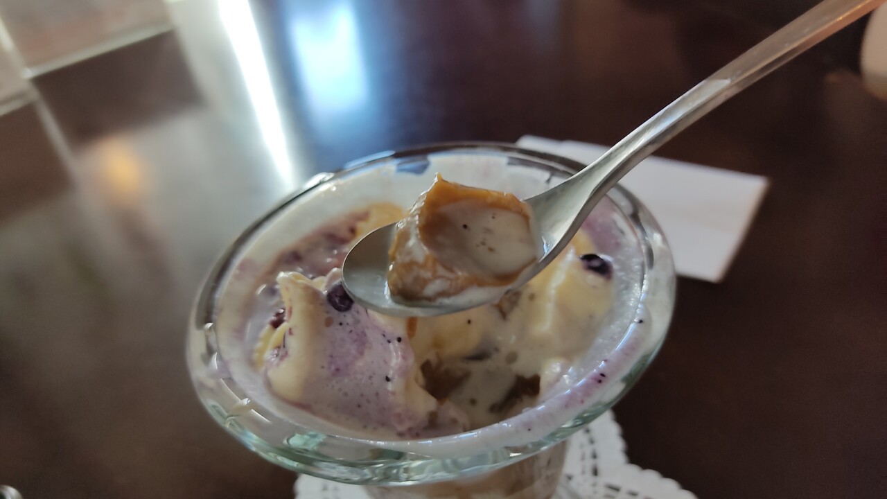 食べ進めるとアイスクリームの層から 珈琲ゼリーの層になります。珈琲ゼリーはビターですがアイスクリームの溶けたクリームと一緒に頂くと メリハリがあり それはもう美味しいんです。