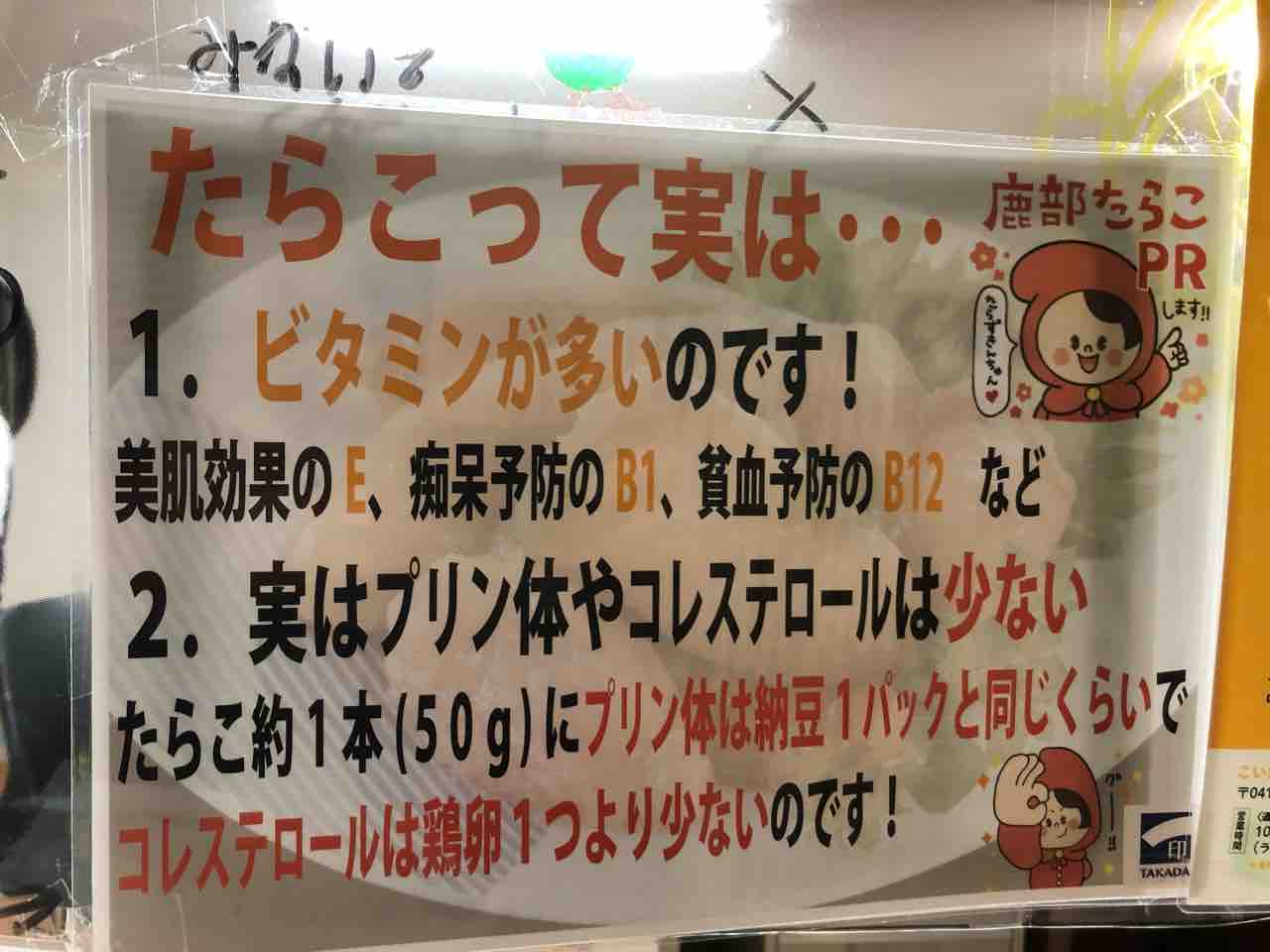 一印高田水産 さんの直売店に入ると写真参照ですが POPが貼られておりまして、たらこって実はプリン体、コレステロールが少なく、ビタミンが多い食材である との事でまた一つ知識を得て博識に近づきました。