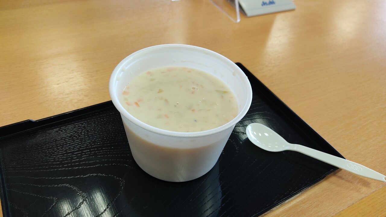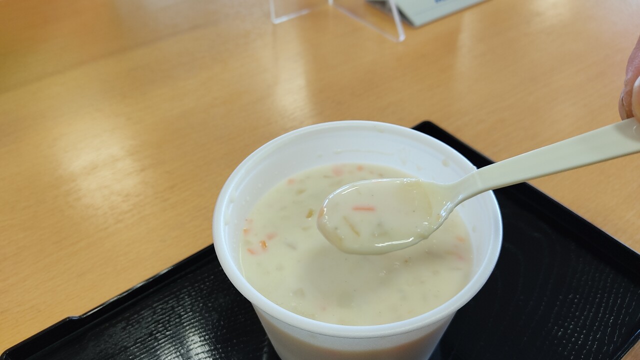 ホタテのエキスが入った美味しいクラムチャウダーでした。スプーンなんかで飲んでられないぜって感じでした。