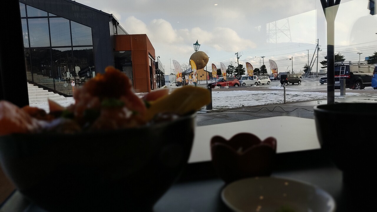 じゃがいものオブジェと海鮮丼を写してみました。右側の丸いのがじゃがいもオブジェです。