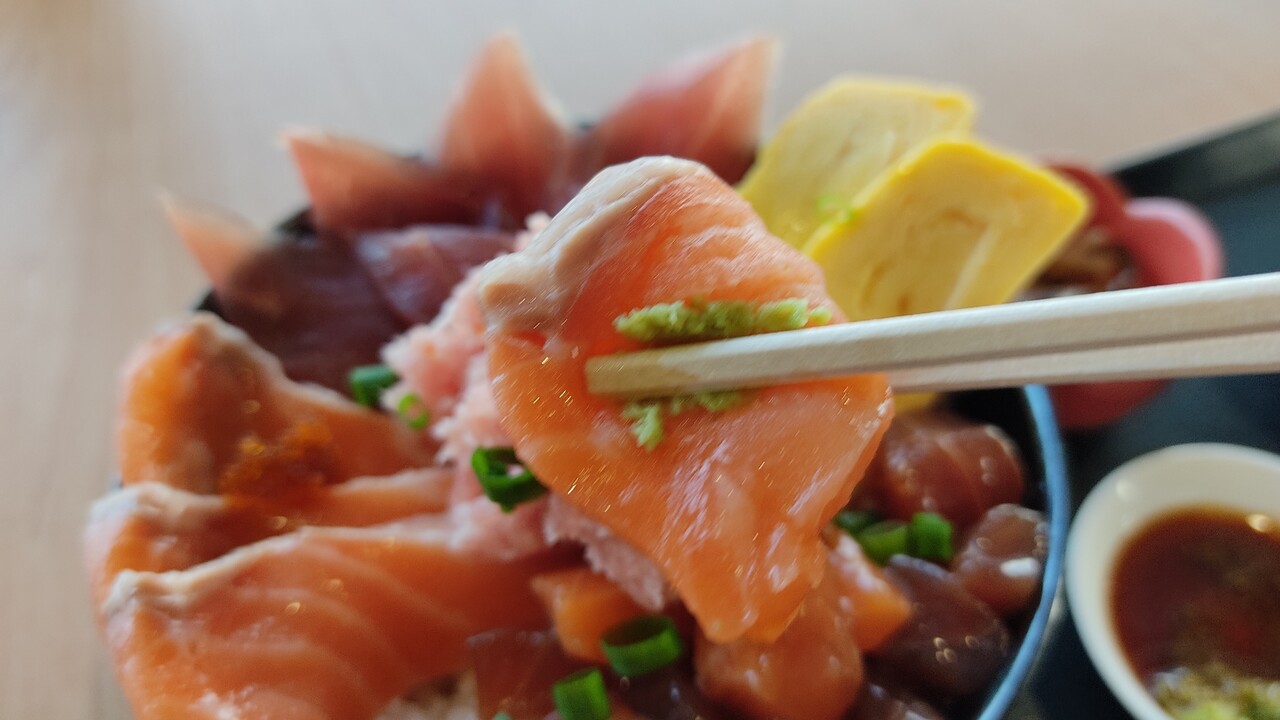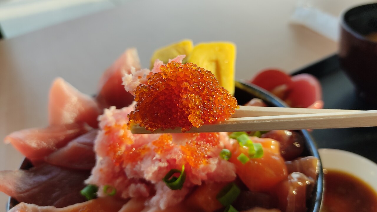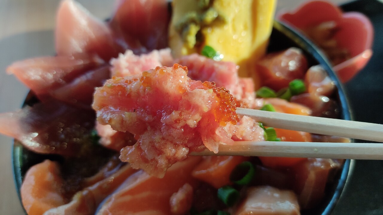 丼から溢れ出しそうな刺身達(サーモン、マグロ、とびっこ、卵焼き、ネギトロ、サーモン、マグロのサイコロカット)
