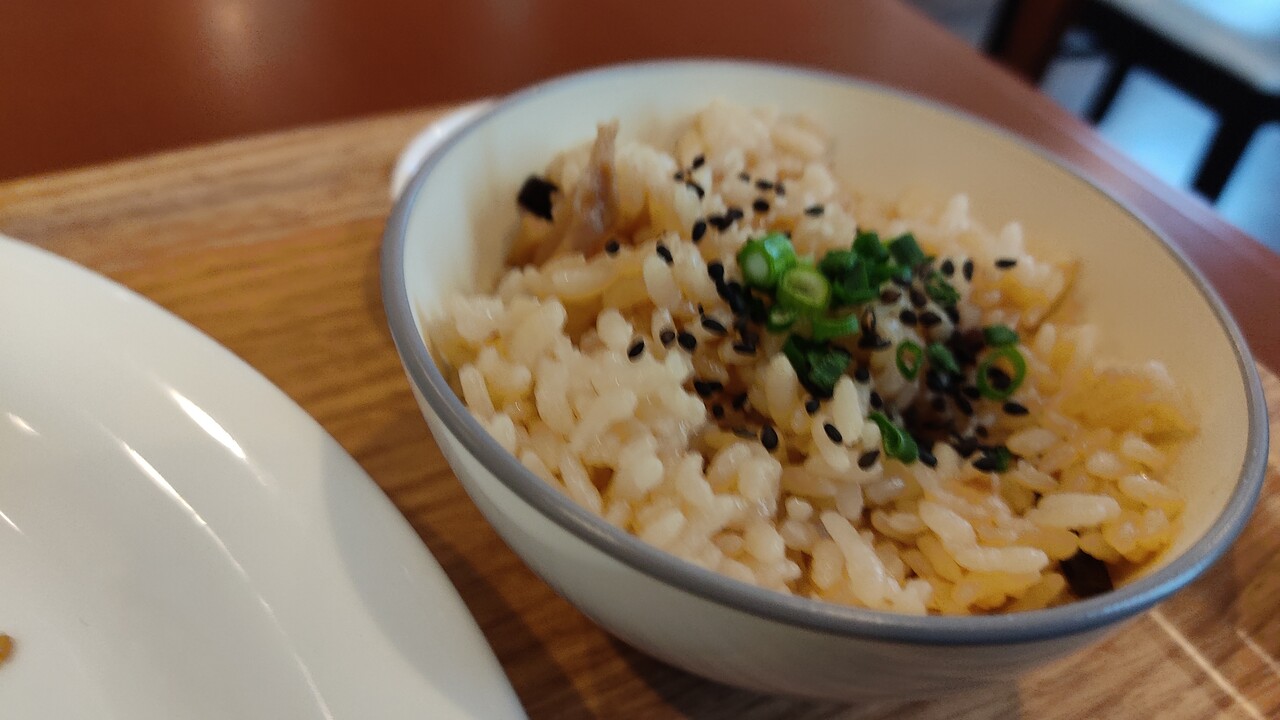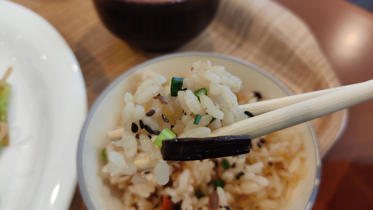 人参、タケノコ、鶏肉、長ネギ、昆布?等が炊き込まれており 上には胡麻塩が振られております。口に運ぶと 胡麻塩の香り塩味が効いており、炊き込みの出汁も香り 美味しく頂けました。