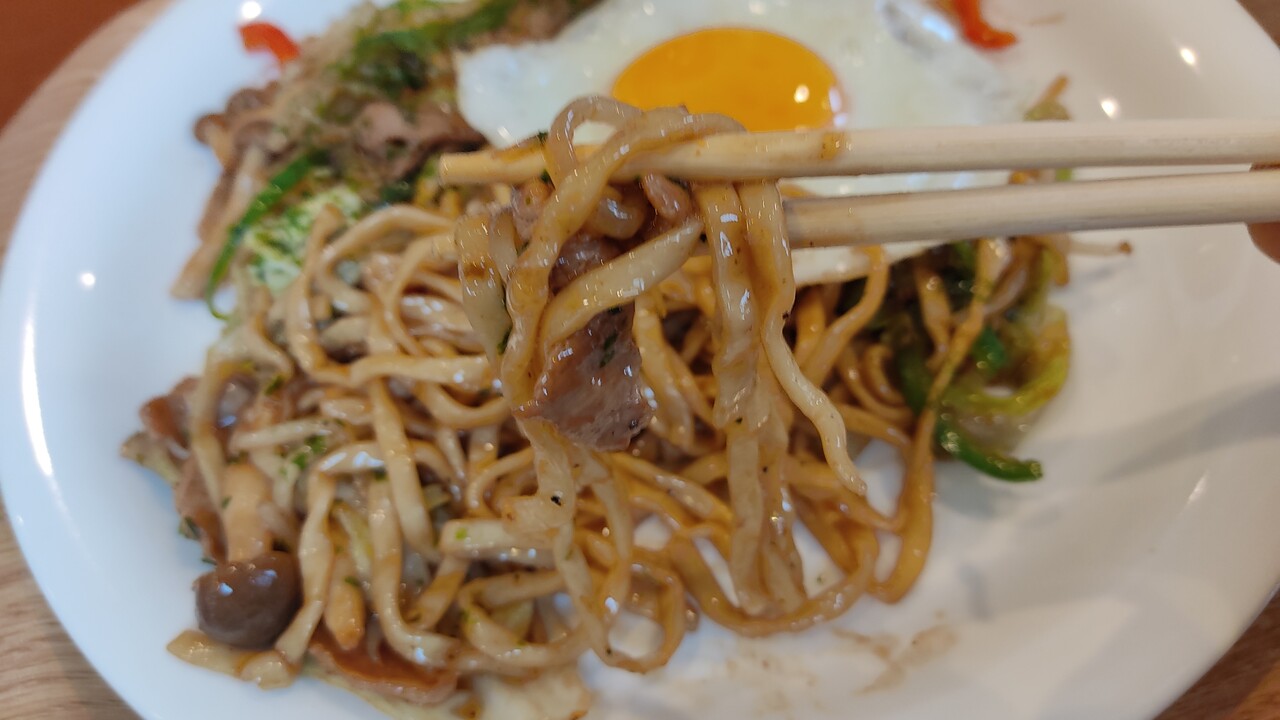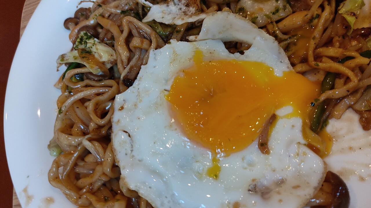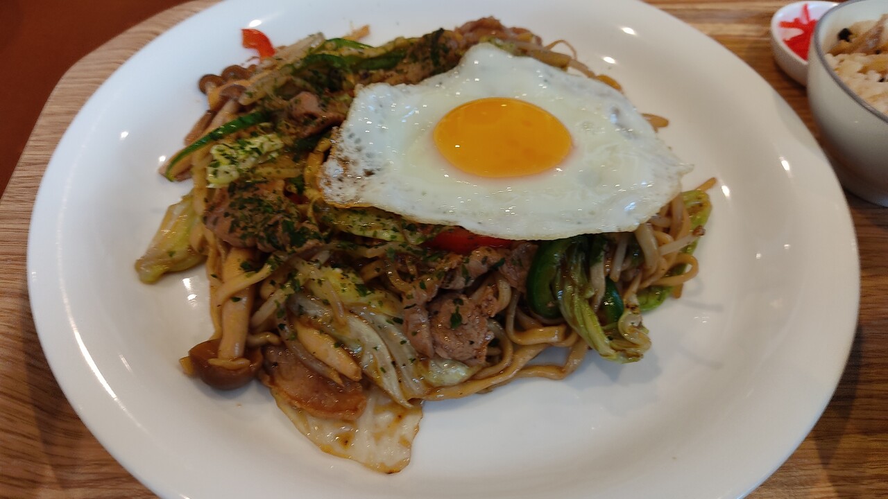具沢山のソース焼きそばに目玉焼きが乗っております。