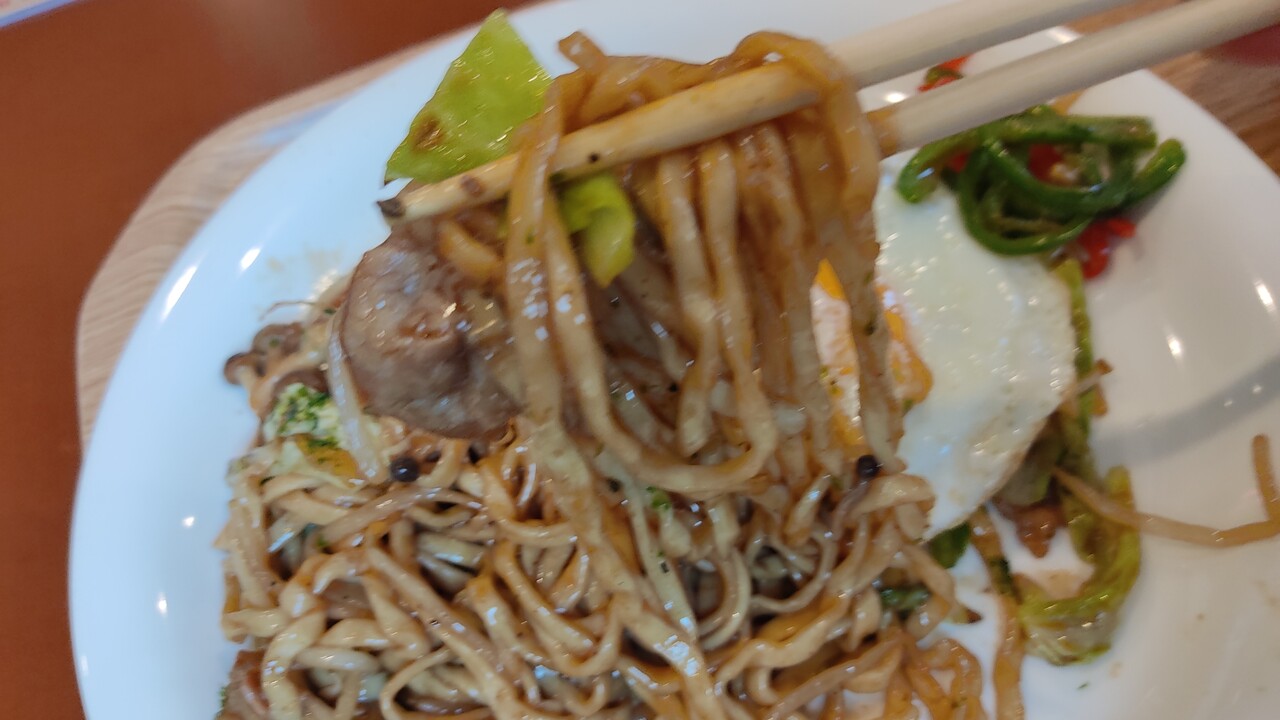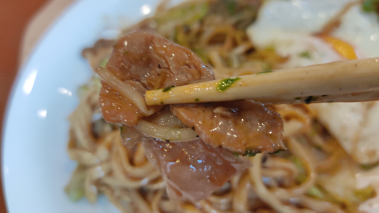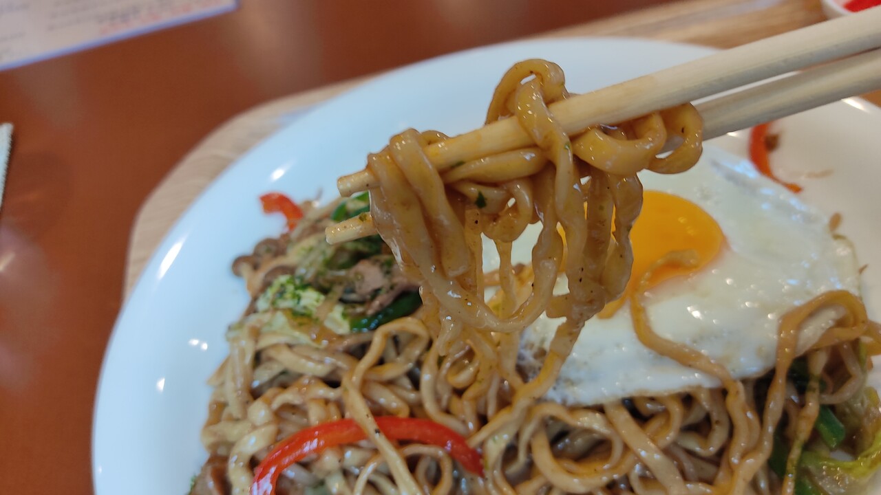 目玉焼きもあるので黄身を潰して絡めて頂きましたが結構甘めのソース焼きそばでしたが まろやかになって美味しいです。