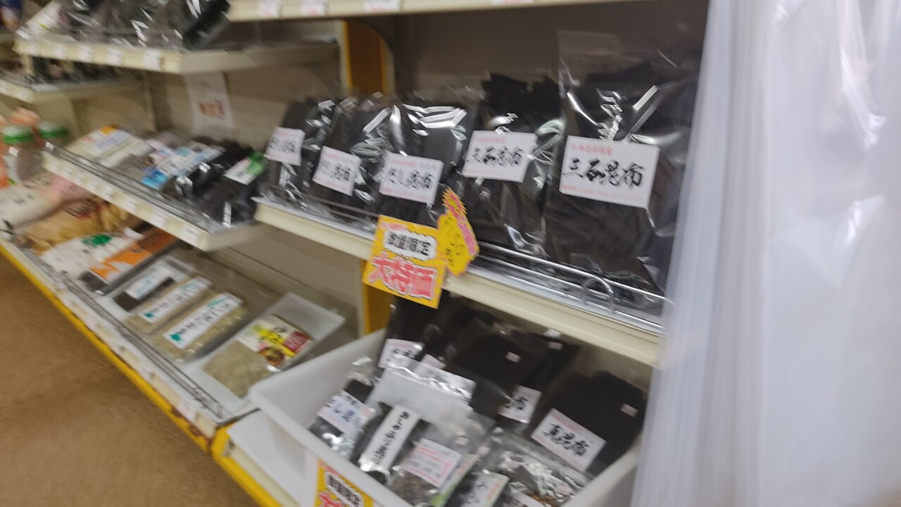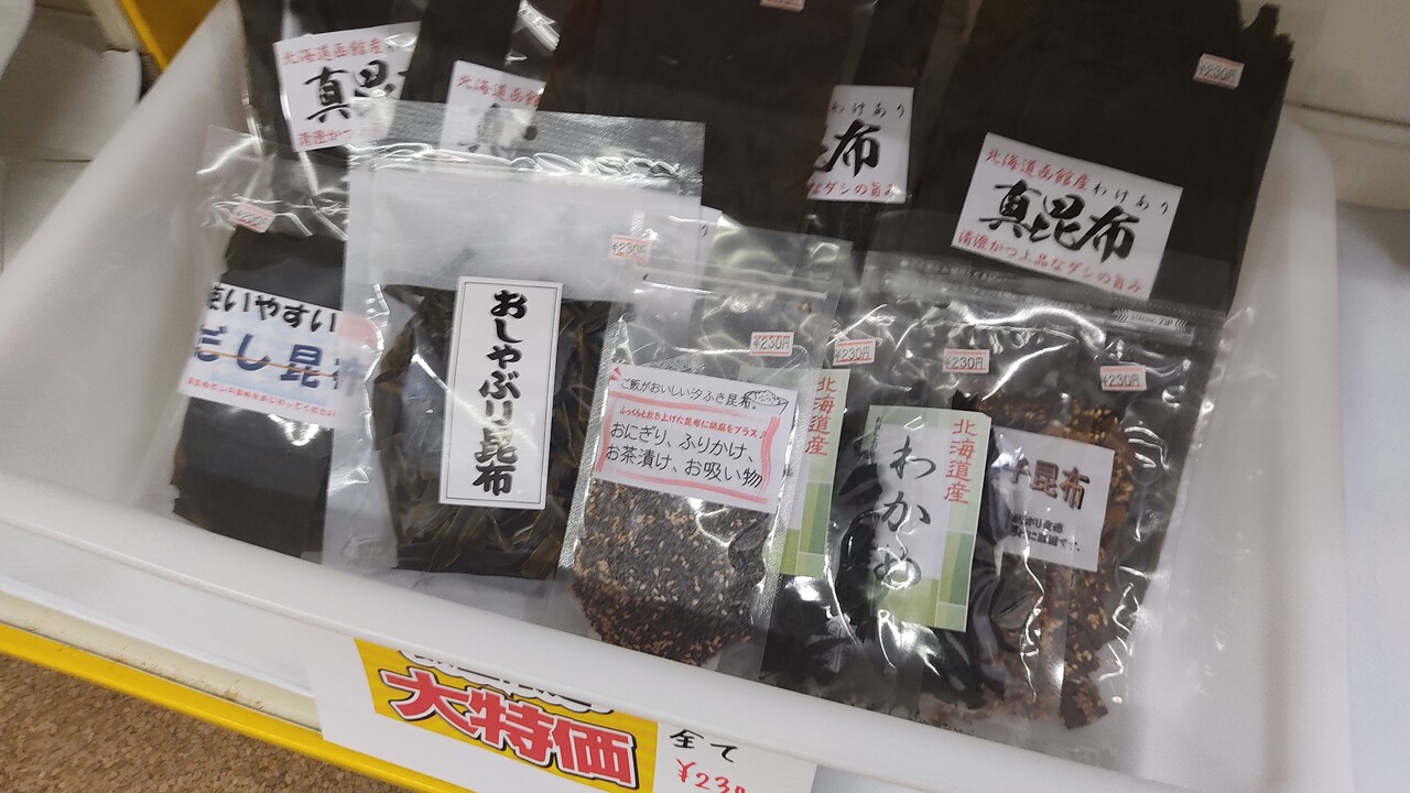 その下には超お買い得商品も並べられております。上の段の昆布は150円で販売されていました 安い!