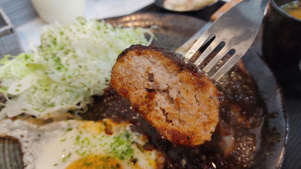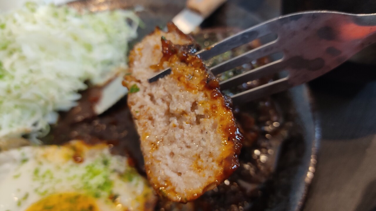 表面の網脂はカリっとしおり、ハンバーグは肉汁が溢れ出すジューシーなものです。ソースは少し濃いかなと思うも食べ進めるとこの位がちょうど良い。