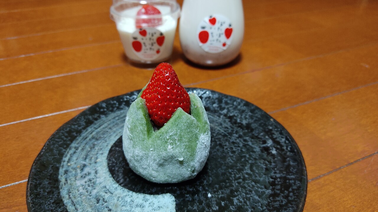 続いては いちご大福 (よもぎ粒あん)(260円税込)も頂いていきます…