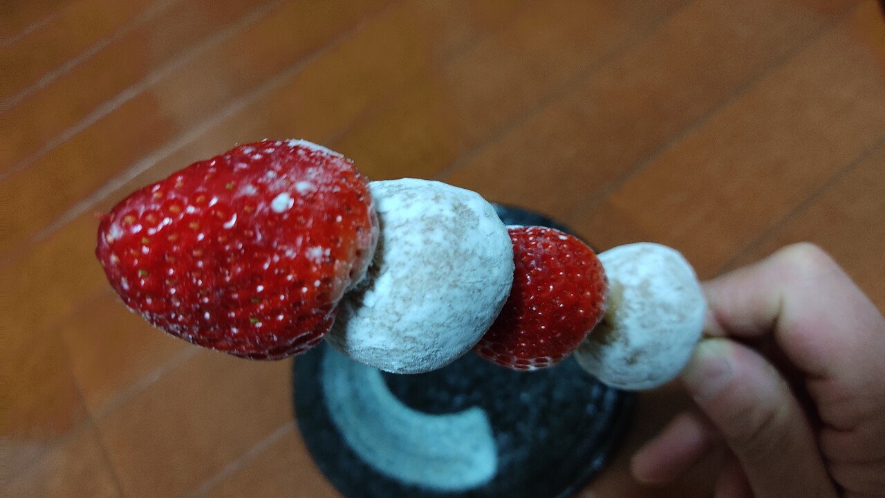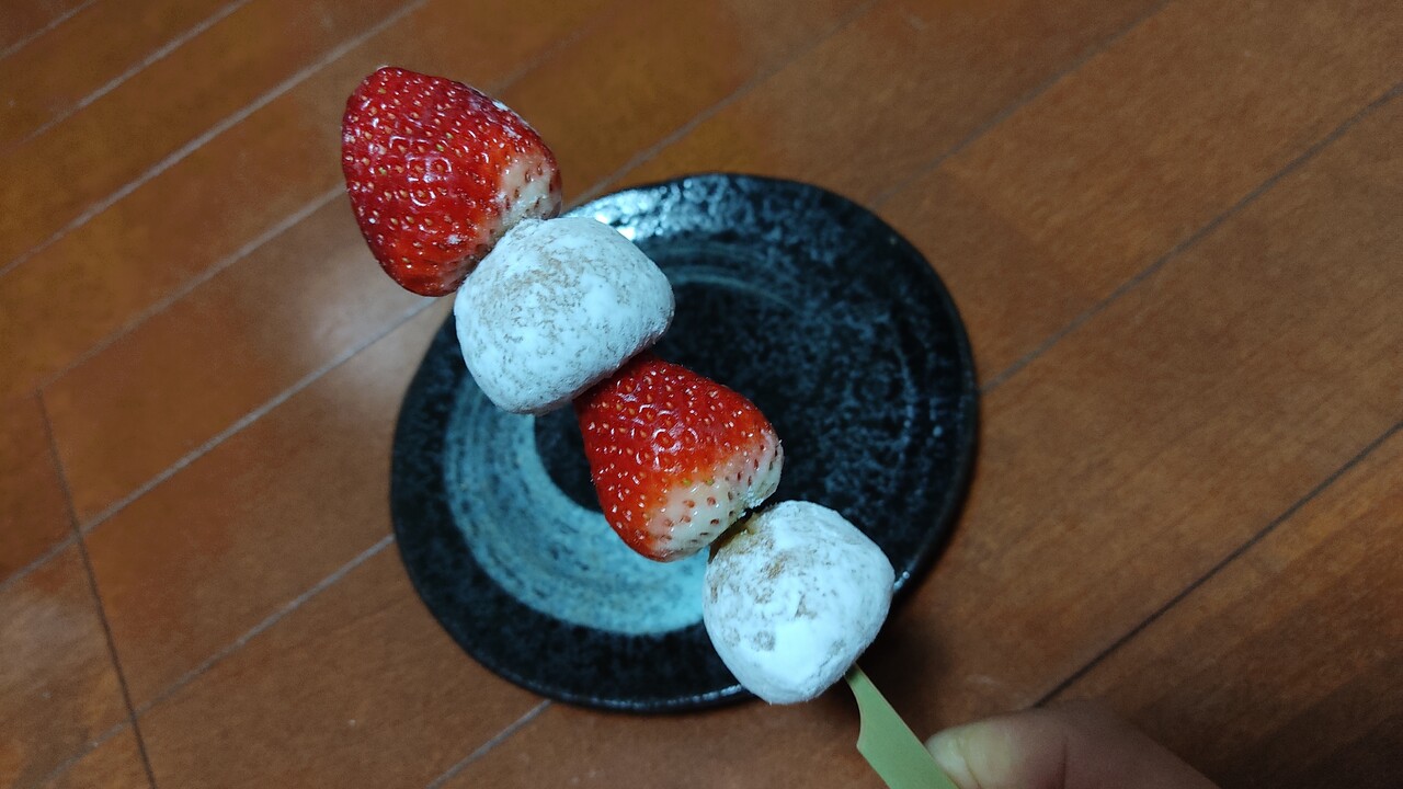 映え感はヤバいですね。頂いてみたいと思います。苺は甘酸っぱく美味しい苺でした。黒糖の団子は表面は固めの黒糖餅です。