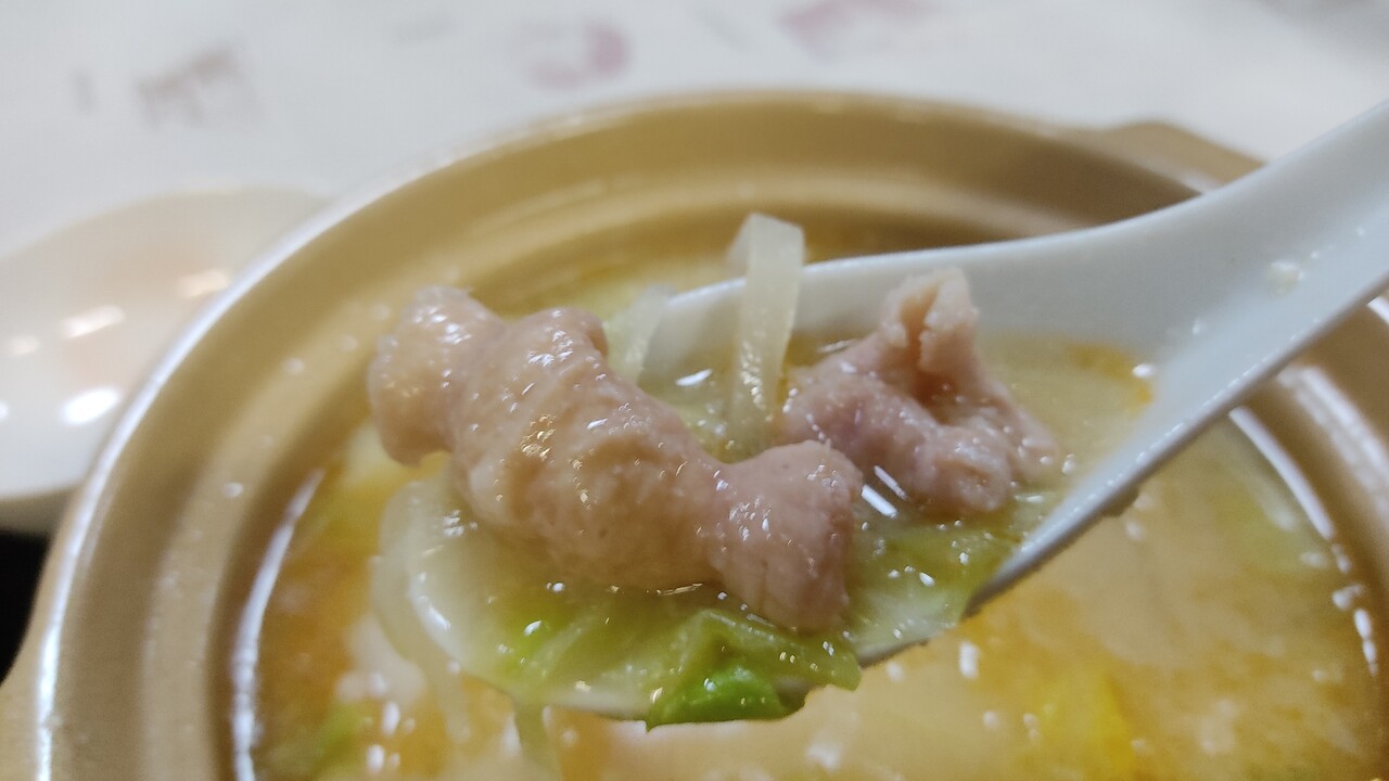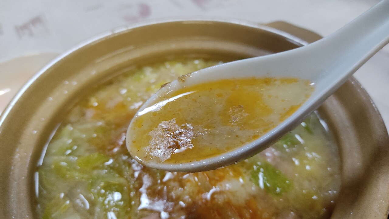 味噌ベースの味付けで 少しだけピリっと辛いスープで キャベツ、玉ねぎ、ホルモンは結構多めに入っておりボリュームはあります。