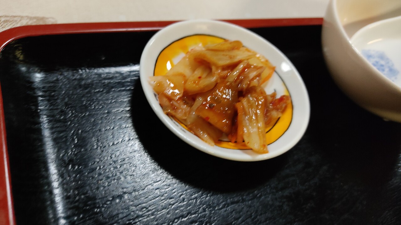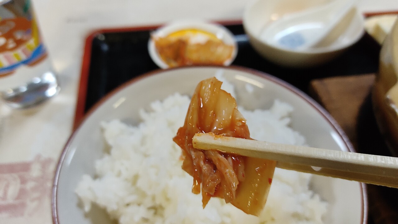 キムチを頂きます…結構酸味のあるキムチで美味しくご飯が進んでしまいます。