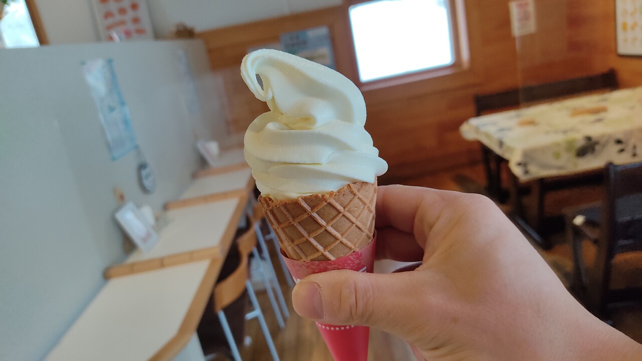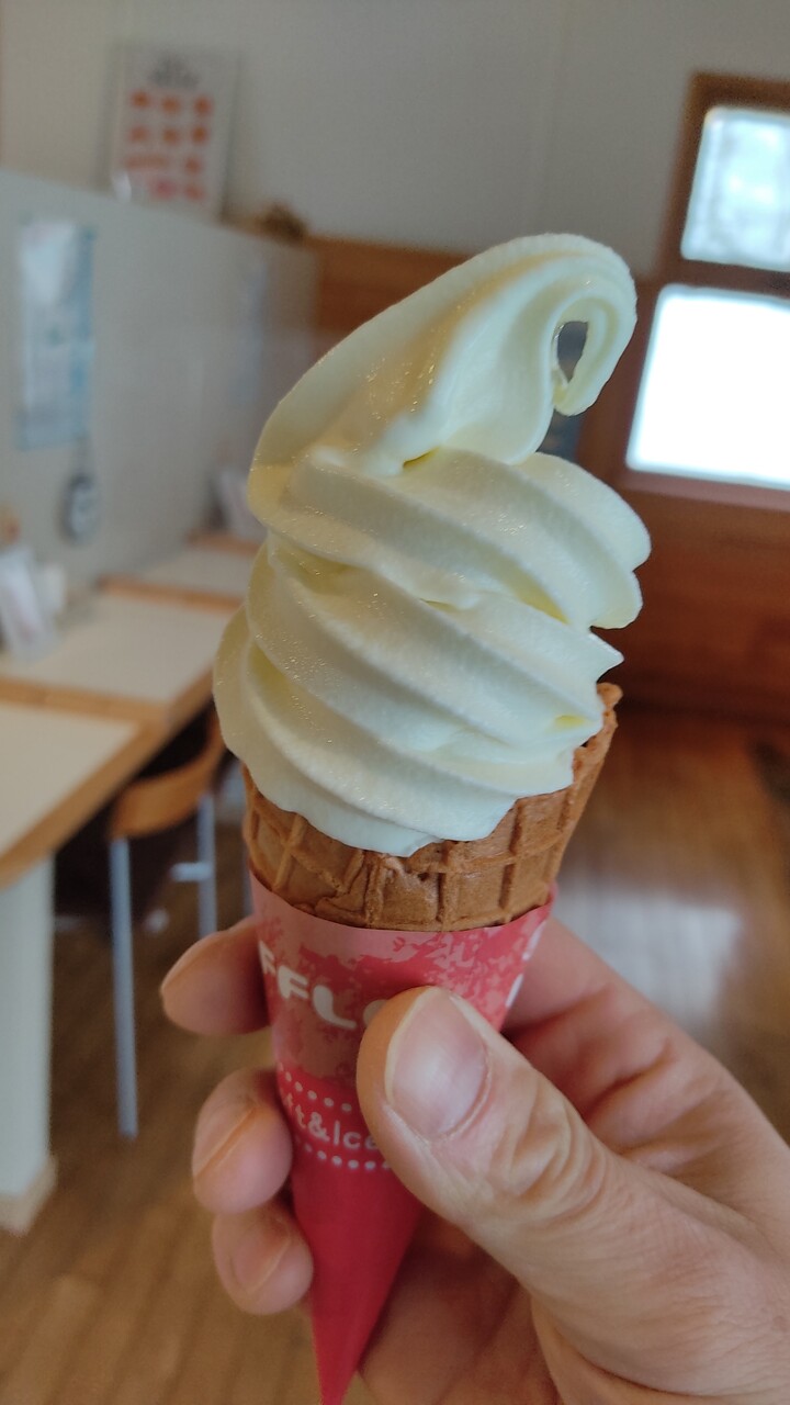 あすなろパン工房さんに来たら ソフトクリームもキメなければなりません。何故なら 150円税込とお安いからです、しかもワッフルコーン。