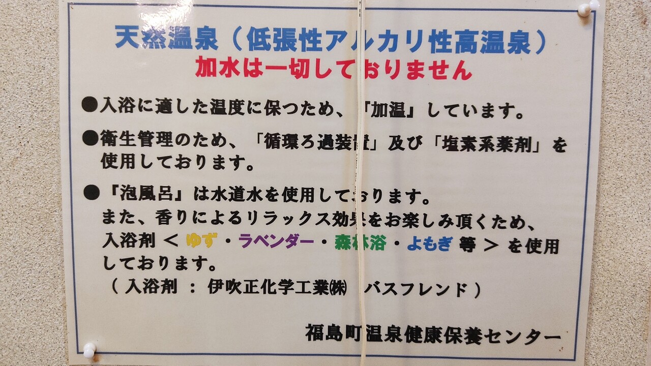 泉質は 低張性アルカリ性高温泉で循環濾過、塩素消毒、加温とされている温泉となります。