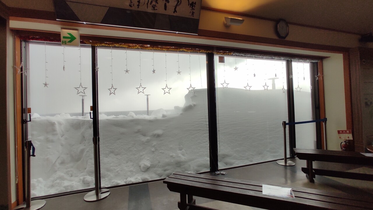 えっ… 窓がほぼ雪に覆われておりました。後ほど道の駅の方に聞くと除雪をしてこのレベルだそうで 本年の日本海側の積雪のヤバさを痛感いたしました。
