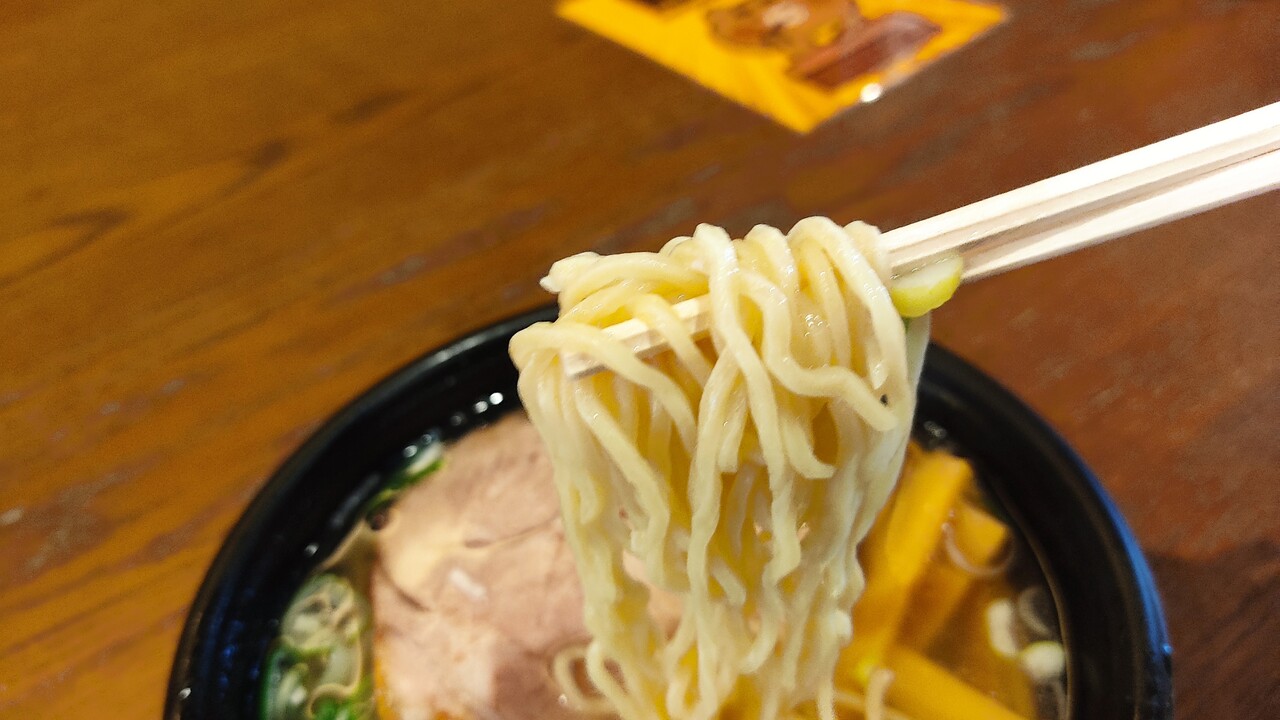 中太縮れ麺を啜ると塩スープが絡み美味しく頂けます。
