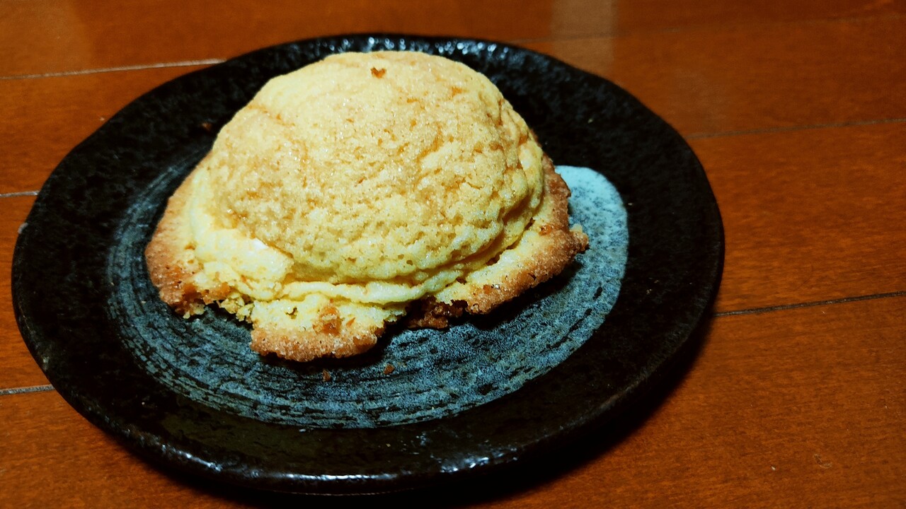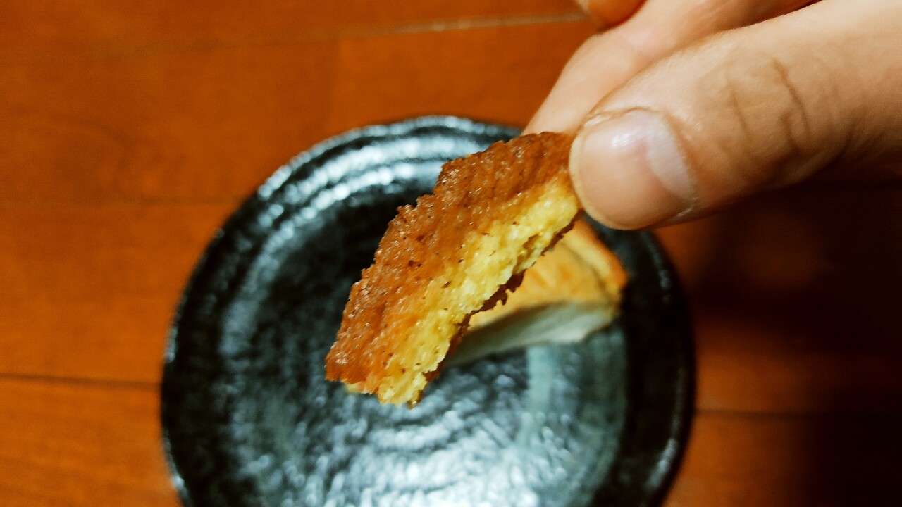 割るとこの様な感じで頂いてみると表面はサクサクっと中はしっとりしており美味しく頂けます。でも少し小さめかなと。