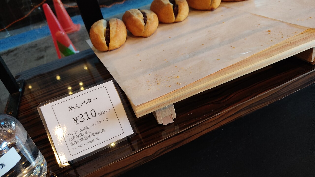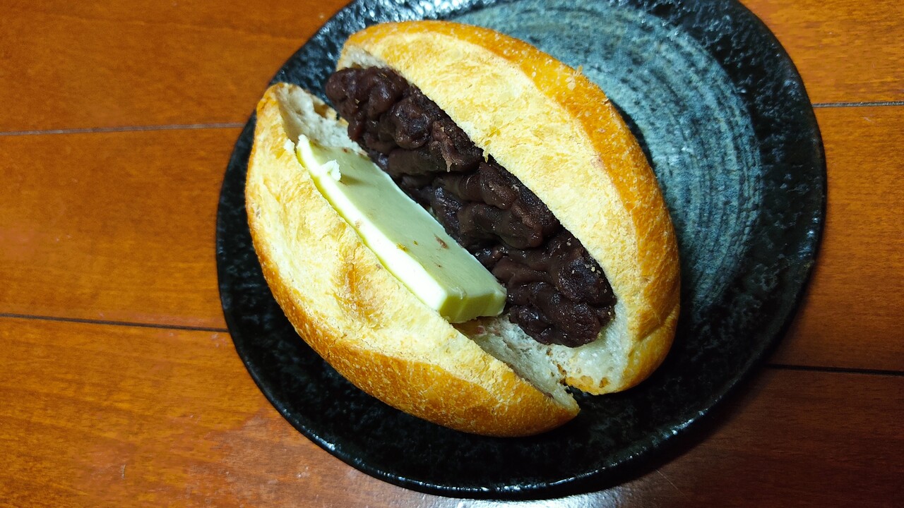パン はフランスパンの様なハード系でバターと粒あんが入っているパンになります。頂いてみるとパンは歯応えがありバターは結構塩気が強く 粒あんは風味も甘みも良く パンとバターと餡子のバランスが良く三位一体で美味しく頂けます。でもバターはやっぱり塩気強めかなと思います。
