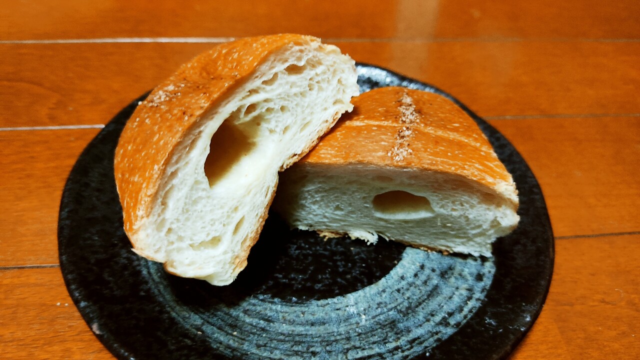 ハーフカットすると以下の様な断面になり頂いてみると程よい塩気で結構モチっとしていてこちらも美味しく頂けました。