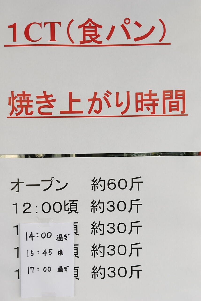 入り口を見ると 1CT(食パン)の焼き上がり予定時間が貼られておりました。