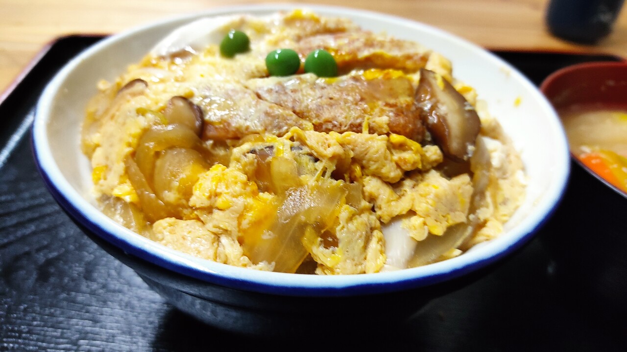 トンカツ、玉ねぎ、椎茸、グリーンピース、タケノコ、卵の内容となります。
