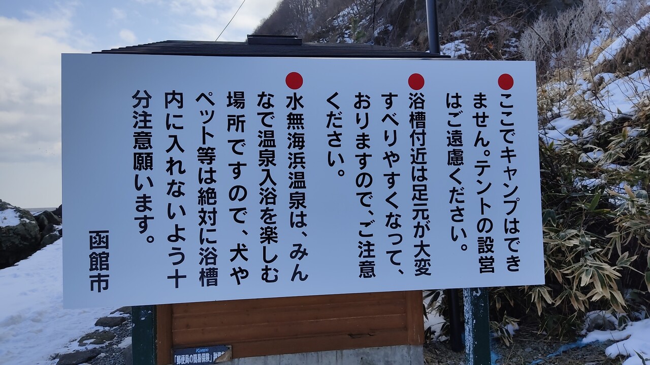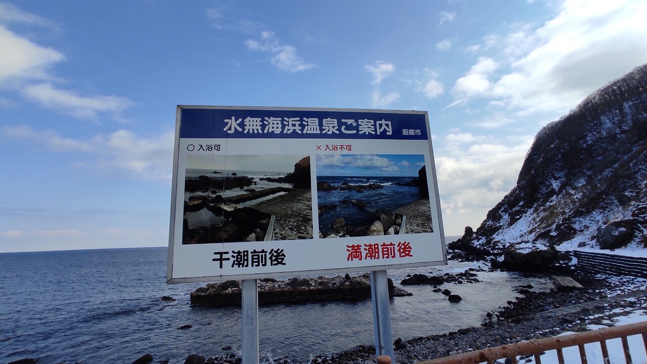 ドライブがてら 水無海浜温泉まで向かい到着しました。 干潮前後(入浴可)、満潮前後(入浴不可)の写真付きの看板もございます。
