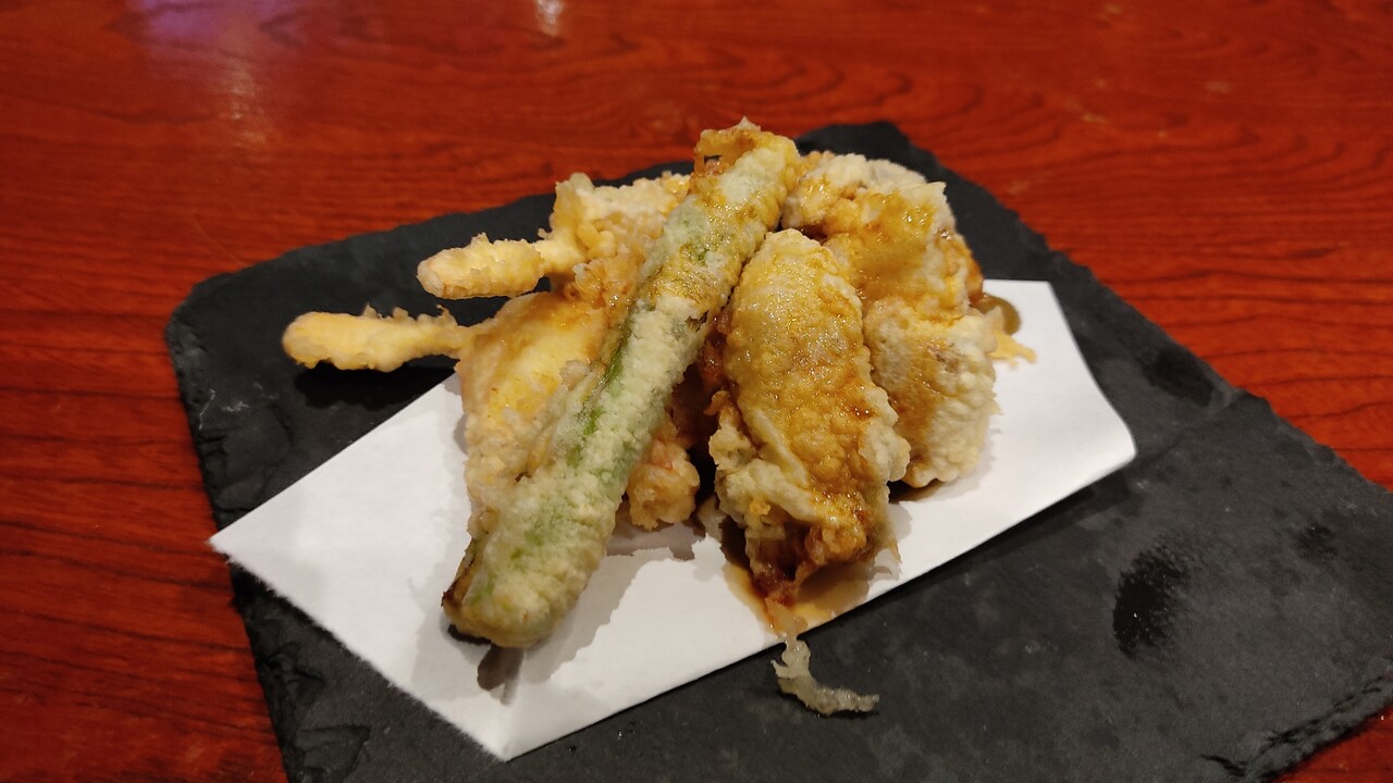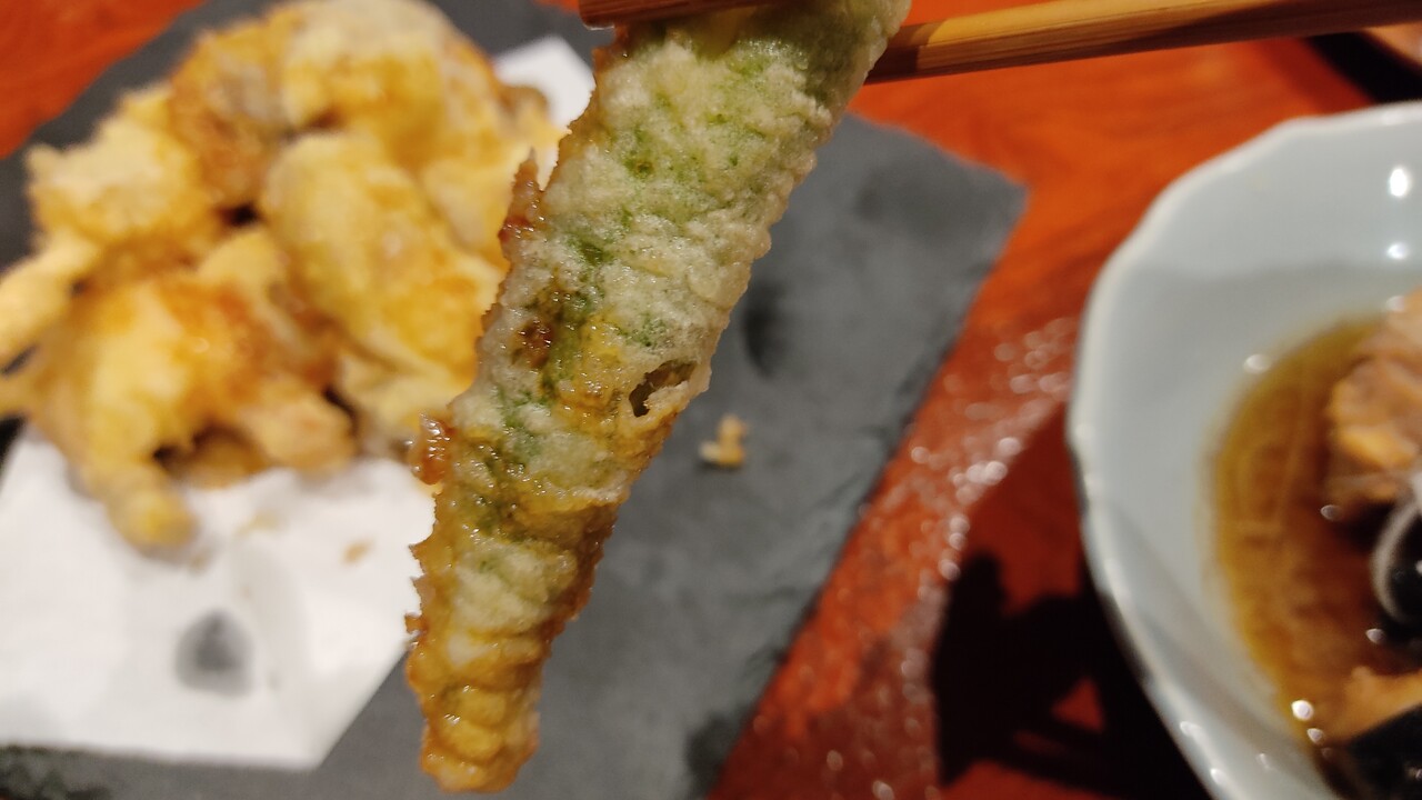 食べていると天ぷらも揚げたてが運ばれてきましたので 頂いていきます…(アスパラガス、牡蠣✖️2、椎茸、エビ、ホタテ)