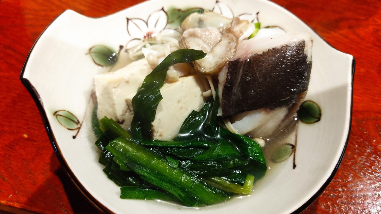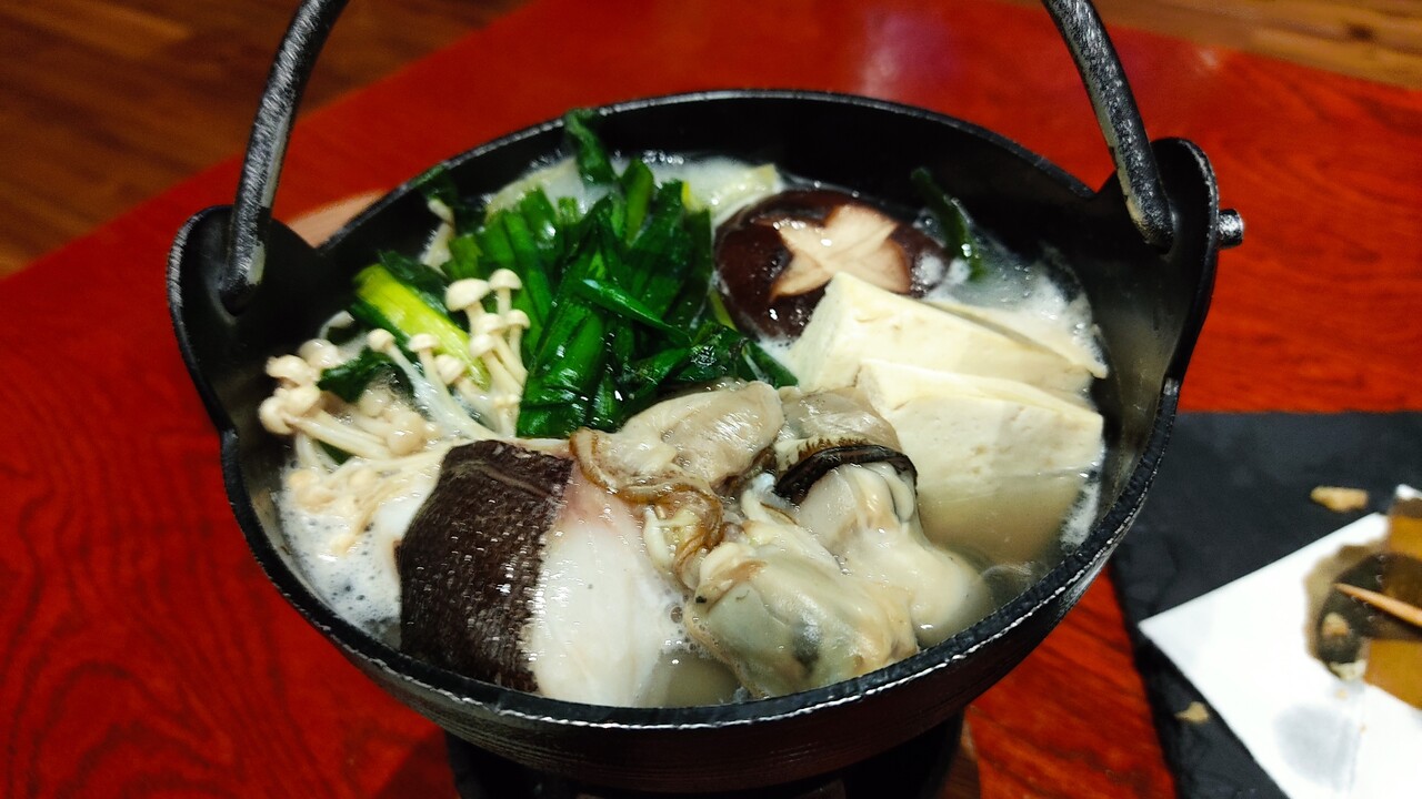 そして牡蠣ニラ鍋もございます(牡蠣、韮、鱈、豆腐、榎茸、白菜)